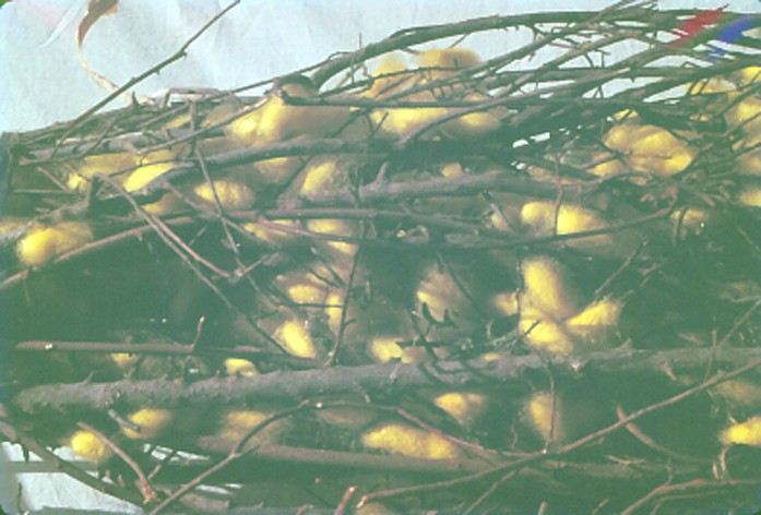 | พ.ศ. 2530 | กิ่งไหมที่ใช้เลี้ยงหนอนไหมแบบโบราณ ก่อนการพัฒนามาใช้จ่อ | สไลด์