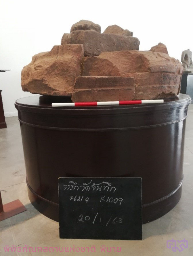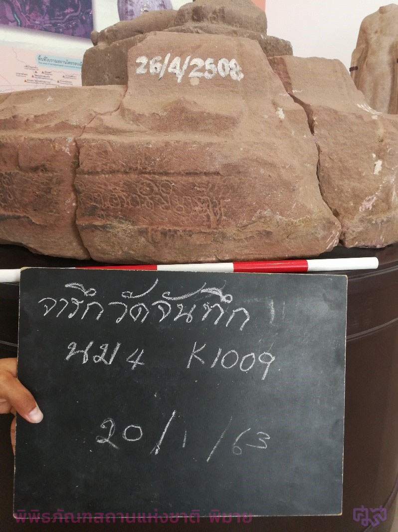 จารึกนี้ แต่เดิมเข้าใจกันว่า มีข้อความอยู่ 2 ตอน ทางหอสมุดแห่งชาติได้ขึ้นทะเบียนไว้เป็นหมายเลข นม. 14 และได้อ่าน-แปลเผยแพร่ไปแล้วตั้งแต่ปี พ.ศ. 2529 ในหนังสือ จารึกในประเทศไทย เล่ม 1 : อักษรปัลลวะ หลังปัลลวะ พุทธศตวรรษที่ 12-14 ต่อมาเมื่อวันที่ 5 มกราคม พ.ศ. 2532 คณะอาจารย์จากภาควิชาภาษาตะวันออก คณะโบราณคดี ได้ไปสำรวจจารึกที่พิพิธภัณฑสถานแห่งชาติ พิมาย ระหว่างสำรวจอยู่นั้น คุณศิริพรรณ ธีรศิริโชติ หัวหน้าพิพิธภัณฑสถานฯ ได้นำจารึกอักษรปัลลวะชิ้นหนึ่ง มีความยาวประมาณ 28 ซม. มาให้ดูว่าจะตรงตามบัญชีจารึกที่นำไปหรือไม่ เมื่อได้พิจารณาดูลักษณะวัตถุและรูปแบบตัวอักษรแล้ว จึงได้ลงความเห็นว่า จารึกชิ้นนั้นเป็นส่วนหนึ่งของฐานบัวรองรับพระพุทธรูป ซึ่งได้จากวัดจันทึก ทั้งนี้เพราะทำด้วยศิลาประเภทเดียวกัน สามารถนำมาต่อกันเป็นวงได้ และมีหมายเลขวัตถุเดียวกัน อีกทั้งยังจารึกด้วยอักษรปัลลวะ ที่มีรูปแบบเหมือนกับจารึก 2 ตอนที่ทางหอสมุดแห่งชาติได้อ่าน-แปลและพิมพ์เผยแพร่ไปแล้วอีกด้วย ส่วนของฐานบัวชิ้นใหม่นี้ มีข้อความอยู่ 2 ตอน ตอนแรกเหลือตัวอักษรอยู่เพียง 2 ตัวสุดท้าย ตอนที่ 2 มีใจความครบถ้วน และตอนนี้เองที่มีจารึกคำว่า “ทวารวตี” ปรากฏอยู่ |