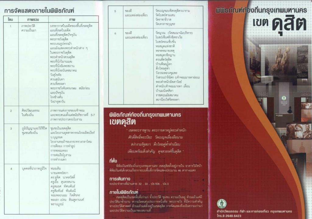 เก็บรวบรวมข้อมูลและเรื่องราวสิ่งก่อสร้าง ศิลปกรรม บุคคล ประวัติศาสตร์ ภูมิปัญญาของชาวเขตดุสิต แผนที่แสดงพระราชวังดุสิต พระที่นั่งวิมานเมฆ พระที่นั่งอนันตสมาคม รัฐสภา วังสุโขทัย พระราชวังจันทรเกษม พระราชวังปารุสกวัน