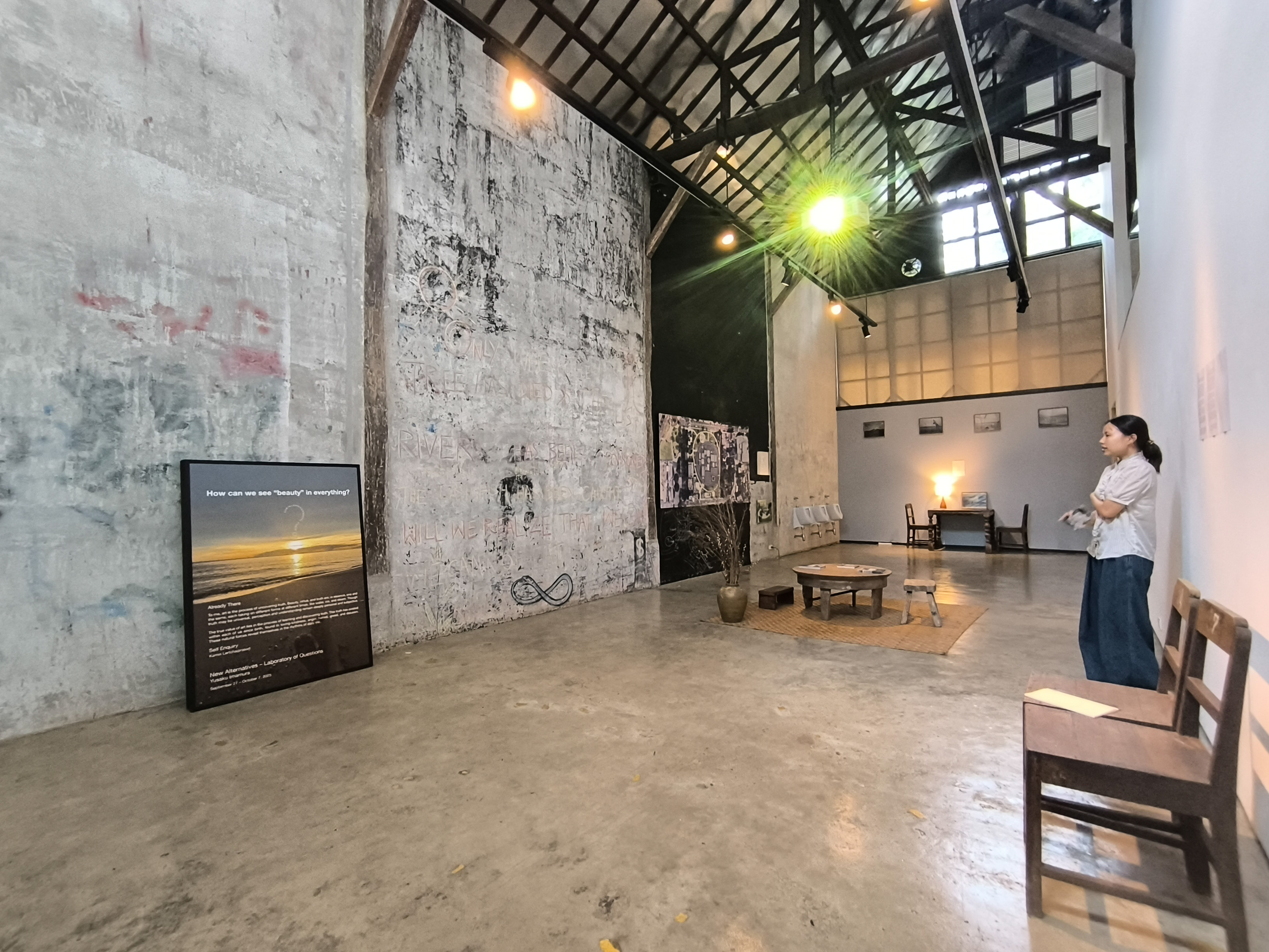 เมื่อเดินเข้าไปจะพบกับอาคารจัดแสดงที่เป็นทั้งสตูดิโอและพื้นที่แสดงงาน เป็นอาคารไม้กึ่งปูนหลังคาสูง โดยส่วนแรกของพื้นที่จัดแสดงจะเป็นทางเข้าจัดแสดงถ้วยชาญี่ปุ่นที่ได้รับการซ่อมแบบคินสึงิ และด้านในเป็นโถงแสดงงานนิทรรศการหมุนเวียน มีส่วนสำนักงานอยู่ชั้นลอยและส่วนจัดแสดงนิทรรศการเป็นโถงเพดานสูง อาคารอยู่ในบริเวณเดียวกับบ้านพักคุณคามินที่ร่มรื่นไปด้วยเงาไม้ ส่วนพื้นที่จัดแสดง Permanent Collection จะอยู่ที่อำเภอสันป่าตอง ผลงานศิลปะทุกชิ้นอนุญาตให้จับ พื้นที่จัดแสดงตั้งใจให้เป็นพื้นที่ Contemporary Spirit พูดถึงความรัก ความเมตตา ผู้ชมสามารถทบทวนตัวเองผ่านงานศิลปะที่จัดแสดง