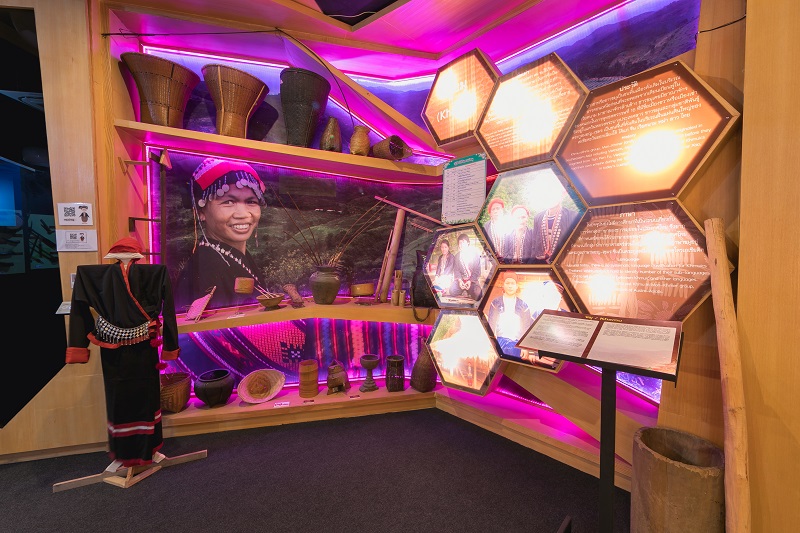 ไฮไลท์ของพิพิธภัณฑ์น่าจะเป็นวัตถุต่างๆ ของแต่ละกลุ่มชาติพันธุ์ที่นำเสนอ หลายชิ้นเป็นของเก่าและหาชมได้ยาก เช่น เครื่องมือล่าดักจับสัตว์ เสื้อผ้าเครื่องประดับ ที่น่าสนใจคือ “เกียเซ็นป๊อง”หรือหนังสือเดินทางข้ามเขตภูเขาของชาวเมี่ยนฉบับเก่าแก่ ที่นำติดตัวครั้งอพยพจากจีนเข้ามาสู่เมืองไทย เป็นป้ายผ้าขนาดยาวหลายเมตรที่เขียนอักษรจีนไว้เต็มผืนผ้า บอกเล่าเกี่ยวกับประวัติของเผ่า ข้อความอนุญาตให้โยกย้ายที่ทำกินได้จากจักรพรรดิจีน ฯลฯ